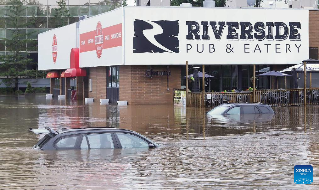 Cars nearly submerged are seen outside a restaurant in Bedford, Nova Scotia, Canada, on July 22, 2023. A province-wide state of emergency has been declared in Nova Scotia on Saturday in response to severe flooding across the eastern province of Canada. (Nova Scotia Government/Handout via Xinhua)