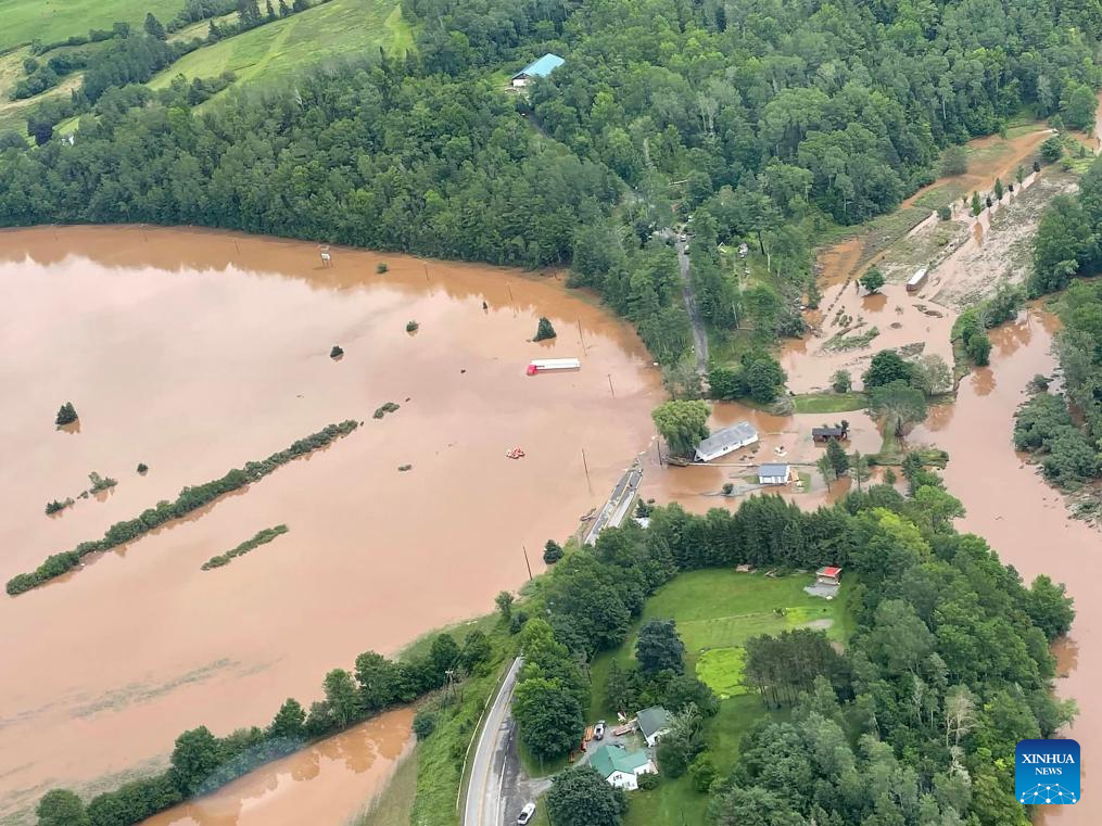 A flooded section of Highway 14 is seen near Three Mile Plains in Hants County, Nova Scotia, Canada, on July 22, 2023. A province-wide state of emergency has been declared in Nova Scotia on Saturday in response to severe flooding across the eastern province of Canada. (Nova Scotia Government/Handout via Xinhua)