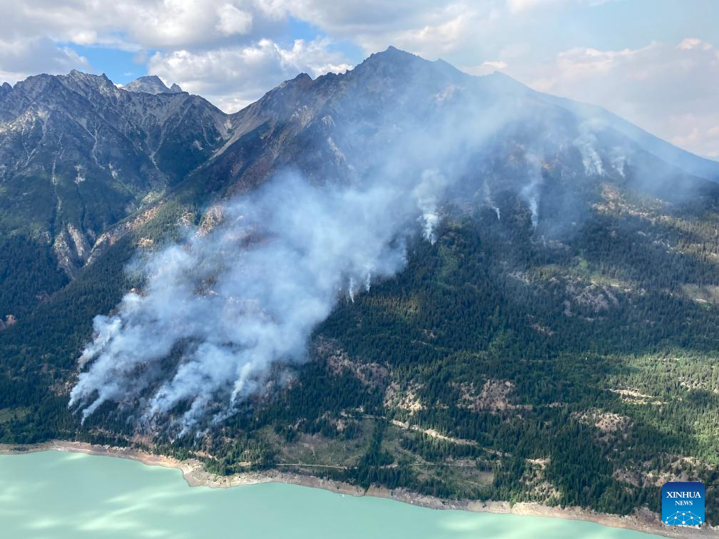 This aerial photo taken on July 26, 2023 provided by BC Wildfire Service shows wildfires near Downton Lake, the southern part of British Columbia in Canada. The Canadian Interagency Forest Fire Centre said Saturday that there were 1,006 active wildfires nationwide, and the number of out-of-control wildfires was 623. This year, the number of wildfires in the country has reached 4,911, devouring about 123,000 square km of land. (BC Wildfire Service/Handout via Xinhua)