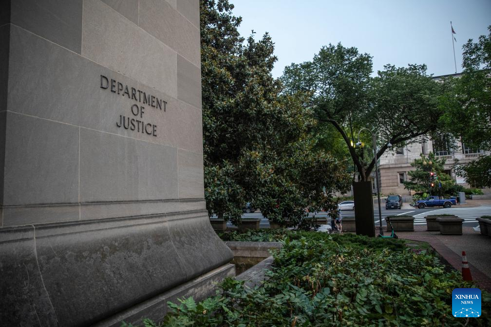 This photo taken on Aug. 1, 2023 shows the U.S. Department of Justice building in Washington, D.C., the United States. Former U.S. President Donald Trump was indicted on Tuesday in a Justice Department investigation for his alleged efforts to overturn the results of the 2020 presidential election. Trump was charged with conspiracy to defraud the United States, conspiracy to obstruct an official proceeding, obstruction of and attempt to obstruct an official proceeding and conspiracy against rights. The indictment is the third criminal case brought against the former president as he seeks to reclaim the White House in 2024. Prosecutors had been investigating Trump's efforts to undermine President Joe Biden's 2020 election victory, and the U.S. Capitol riot on Jan. 6, 2021. (Photo by Aaron Schwartz/Xinhua)