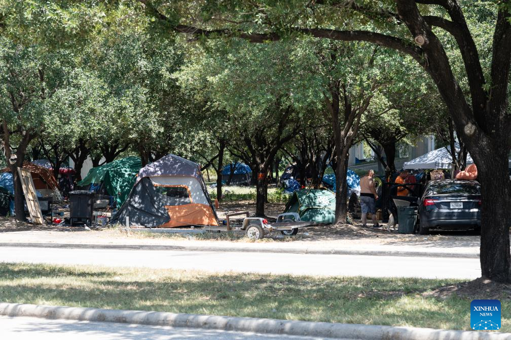 Homeless people stay in tents despite the extreme heat in Houston, Texas, the United States, on Aug. 4, 2023. (Photo by Chen Chen/Xinhua)