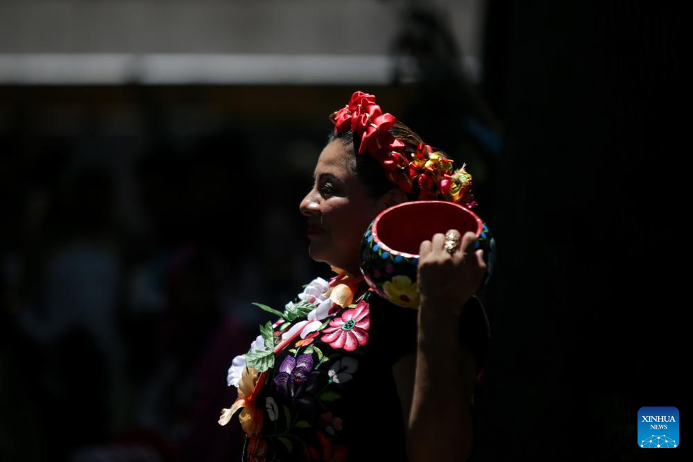An actress in traditional attire celebrates the International Day of the World's Indigenous Peoples in Mexico City, Mexico, Aug. 9, 2023. (Photo by Francisco Canedo/Xinhua)