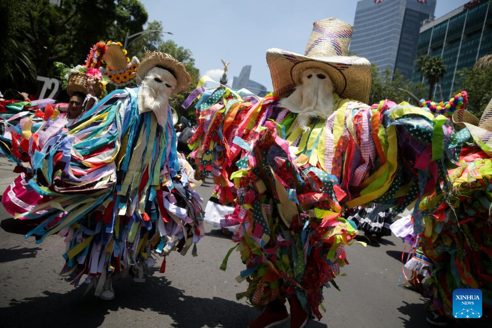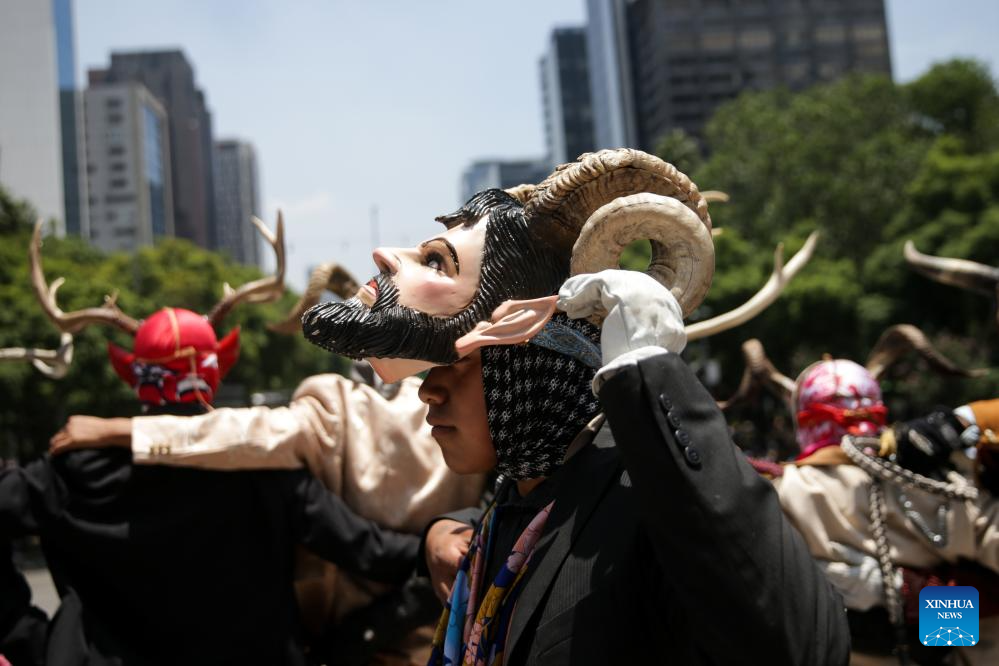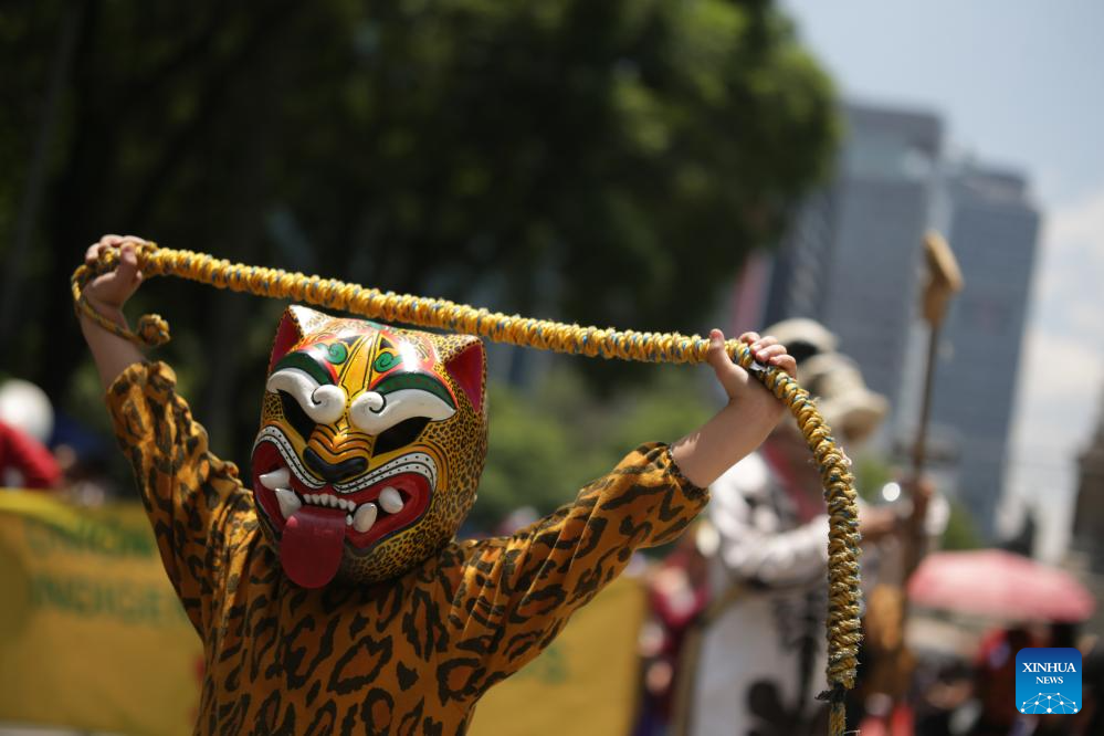 Actors in traditional attires celebrate the International Day of the World's Indigenous Peoples in Mexico City, Mexico, Aug. 9, 2023. (Photo by Francisco Canedo/Xinhua)