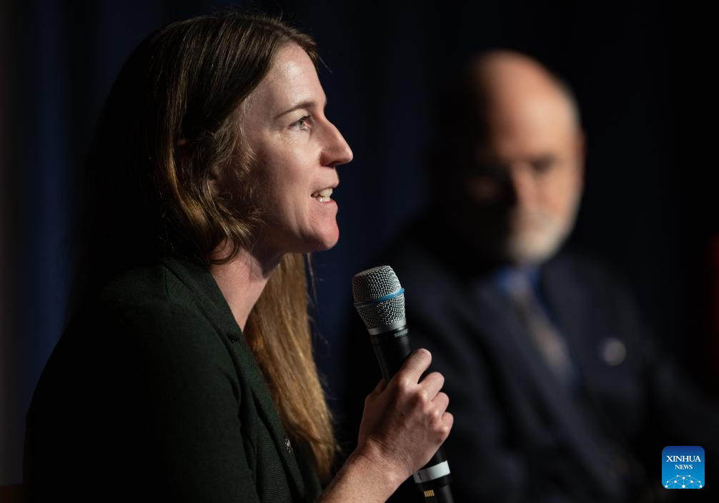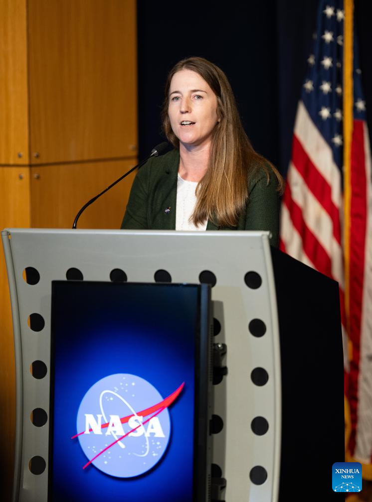 Katherine Calvin, NASA chief scientist and senior climate advisor, answers a question during a news conference to discuss the latest global temperature data at NASA headquarters in Washington, D.C., the United States, on Aug. 14, 2023. July 2023 was hotter than any other month in the global temperature record since 1880, according to analysis released by the U.S. National Aeronautics and Space Administration (NASA)'s Goddard Institute for Space Studies (GISS) on Monday. (Joel Kowsky/NASA/Handout via Xinhua)