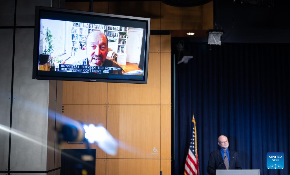 Director of NASA's Goddard Institute for Space Studies Gavin Schmidt is seen on a monitor as he speaks during a news conference to discuss the latest global temperature data at NASA headquarters in Washington, D.C., the United States, on Aug. 14, 2023. July 2023 was hotter than any other month in the global temperature record since 1880, according to analysis released by the U.S. National Aeronautics and Space Administration (NASA)'s Goddard Institute for Space Studies (GISS) on Monday. (Joel Kowsky/NASA/Handout via Xinhua)