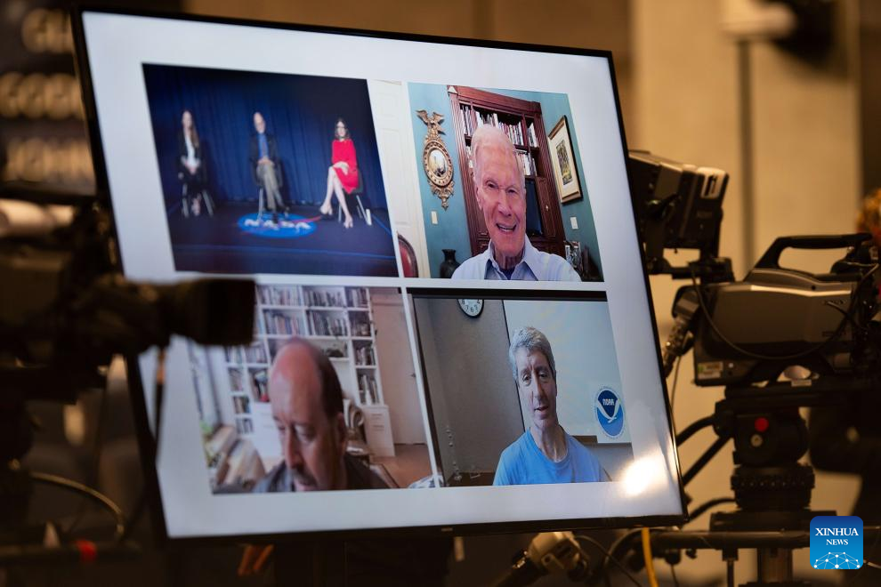 NASA Administrator Bill Nelson (R, Top) is seen on a monitor as he speaks during a news conference to discuss the latest global temperature data at NASA headquarters in Washington, D.C., the United States, on Aug. 14, 2023. July 2023 was hotter than any other month in the global temperature record since 1880, according to analysis released by the U.S. National Aeronautics and Space Administration (NASA)'s Goddard Institute for Space Studies (GISS) on Monday. (Joel Kowsky/NASA/Handout via Xinhua)