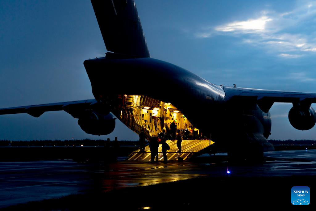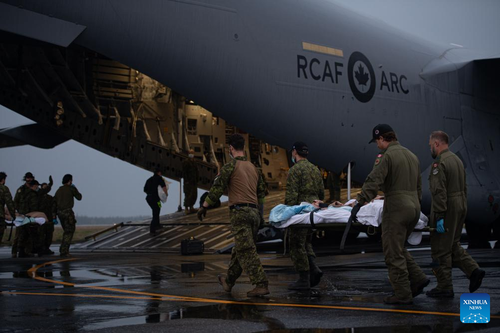 This photo taken on Aug. 18, 2023 shows an aircraft getting ready for the relocation of hospital patients from the Yellowknife hospital to Vancouver at the Yellowknife airport in Yellowknife, Northwest Territories, Canada. The Canadian Armed Forces participated in an evacuation operation, helping residents out of Yellowknife as wildfires approached the city. (Canadian Armed Forces/Handout via Xinhua)