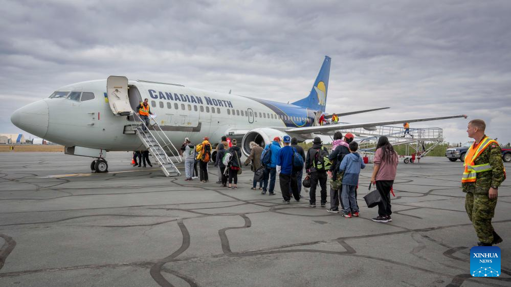 Members of the Canadian Armed Forces guide people to board a civilian aircraft for Calgary at the Yellowknife airport in Yellowknife, Northwest Territories, Canada, on Aug. 18, 2023. The Canadian Armed Forces participated in an evacuation operation, helping residents out of Yellowknife as wildfires approached the city. (Canadian Armed Forces/Handout via Xinhua)