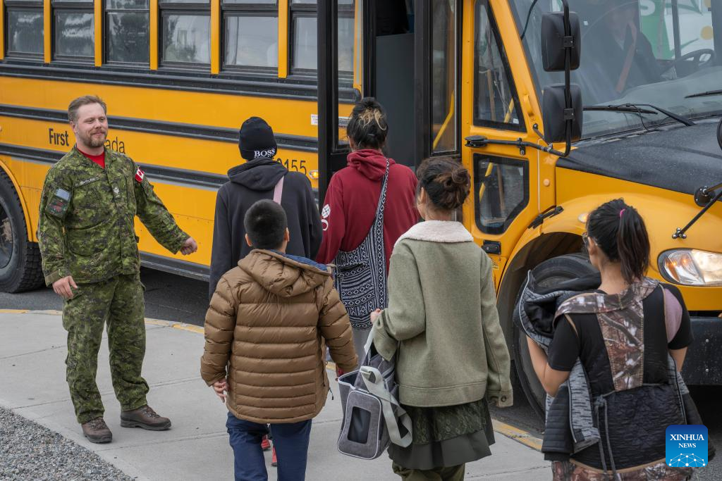 A member of the Canadian Armed Forces directs people on to a bus destined for the Yellowknife airport in Yellowknife, Northwest Territories, Canada, on Aug. 18, 2023. The Canadian Armed Forces participated in an evacuation operation, helping residents out of Yellowknife as wildfires approached the city. (Canadian Armed Forces/Handout via Xinhua)