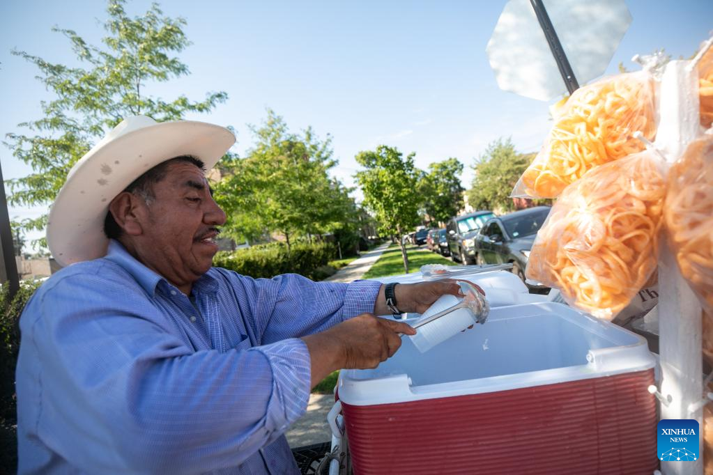 A man sells flavored ice snacks in the street in Chicago, the United States, on Aug. 23, 2023. The temperature at O'Hare International Airport in Chicago, the third most populous city in the United States, reached 98 degrees Fahrenheit (36.67 degrees Celsius) Wednesday afternoon, breaking the city's previous daily high temperature record for Aug. 23 of 97 degrees Fahrenheit (36.11 degrees Celsius), according to the U.S. National Weather Service.