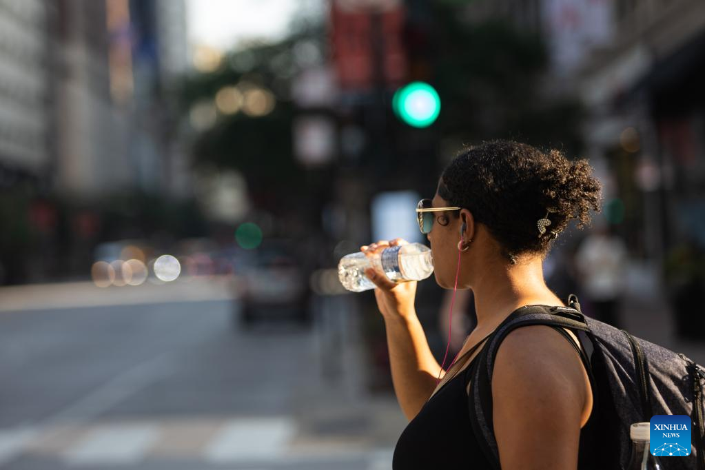 A woman drinks water in downtown Chicago, the United States, on Aug. 23, 2023 The temperature at O'Hare International Airport in Chicago, the third most populous city in the United States, reached 98 degrees Fahrenheit (36.67 degrees Celsius) Wednesday afternoon, breaking the city's previous daily high temperature record for Aug. 23 of 97 degrees Fahrenheit (36.11 degrees Celsius), according to the U.S. National Weather Service.
