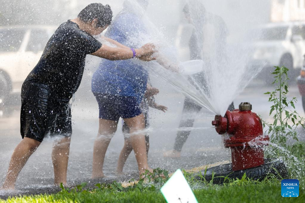Kids and adults cool off beside an open fire hydrant in the New City neighborhood on the southwest side of Chicago, the United States, on Aug. 23, 2023. The temperature at O'Hare International Airport in Chicago, the third most populous city in the United States, reached 98 degrees Fahrenheit (36.67 degrees Celsius) Wednesday afternoon, breaking the city's previous daily high temperature record for Aug. 23 of 97 degrees Fahrenheit (36.11 degrees Celsius), according to the U.S. National Weather Service.