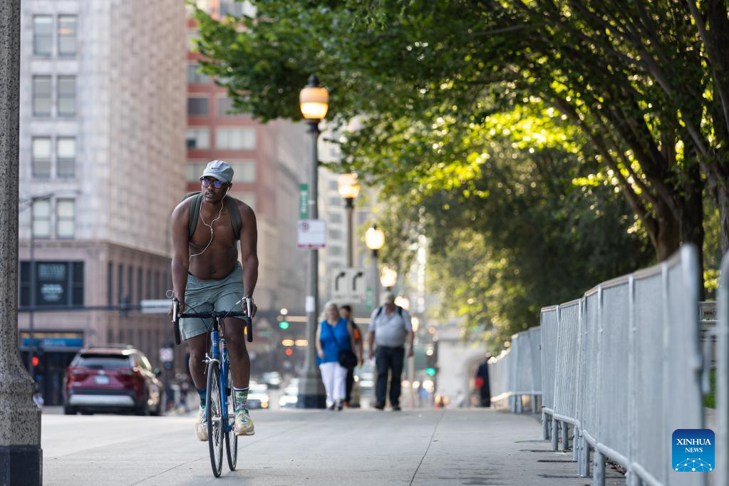 A biker goes through downtown Chicago with shirts off, the United States, on Aug. 23, 2023. The temperature at O'Hare International Airport in Chicago, the third most populous city in the United States, reached 98 degrees Fahrenheit (36.67 degrees Celsius) Wednesday afternoon, breaking the city's previous daily high temperature record for Aug. 23 of 97 degrees Fahrenheit (36.11 degrees Celsius), according to the U.S. National Weather Service.