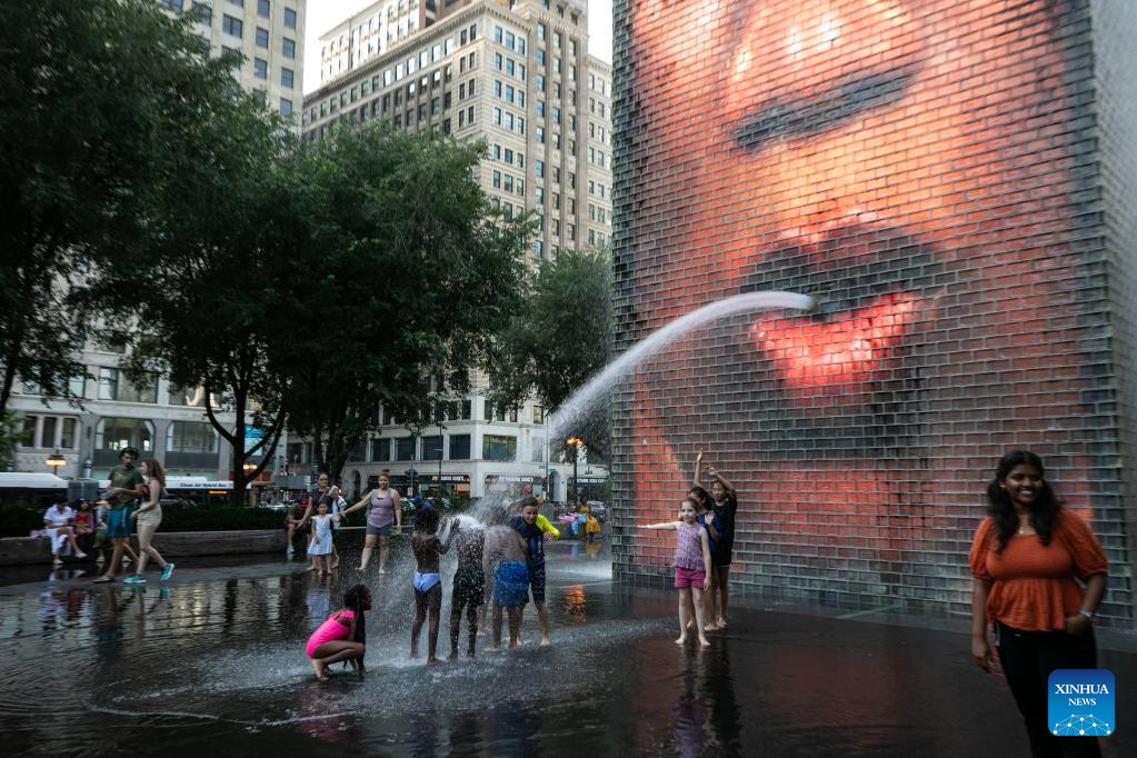 Children cool down at Crown Fountain in downtown Chicago, the United States, on Aug. 23, 2023. The temperature at O'Hare International Airport in Chicago, the third most populous city in the United States, reached 98 degrees Fahrenheit (36.67 degrees Celsius) Wednesday afternoon, breaking the city's previous daily high temperature record for Aug. 23 of 97 degrees Fahrenheit (36.11 degrees Celsius), according to the U.S. National Weather Service.