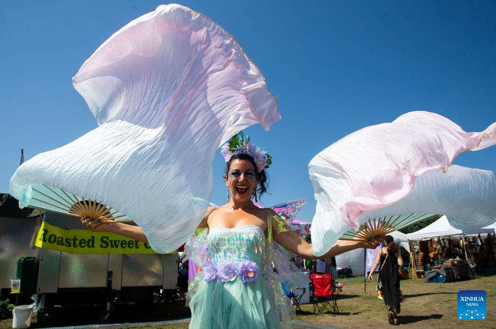 A busker poses for photos during the 2023 Toronto International BuskerFest in Toronto, Canada, on Sept. 4, 2023. This event was held here from Sept. 1 to 4 with the participation of about 100 street performers from around the world. (Photo by Zou Zheng/Xinhua)
