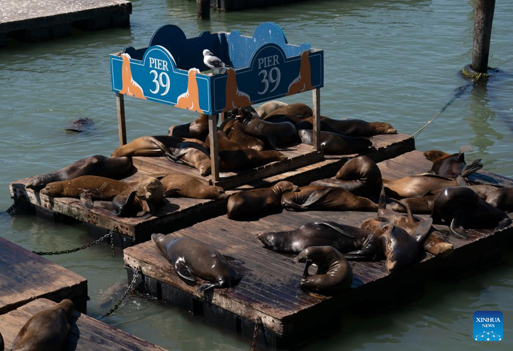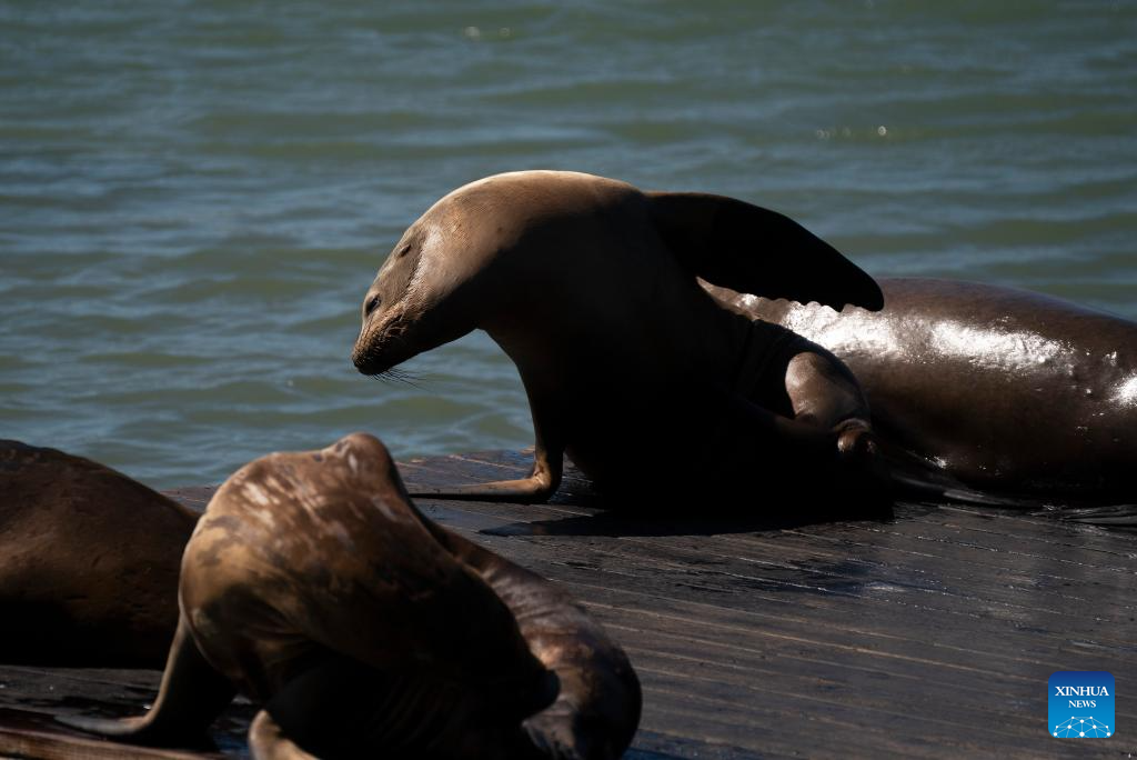 Sea lions are pictured at Pier 39 in San Francisco, the United States, Sept. 11, 2023. (Photo by Li Jianguo/Xinhua)