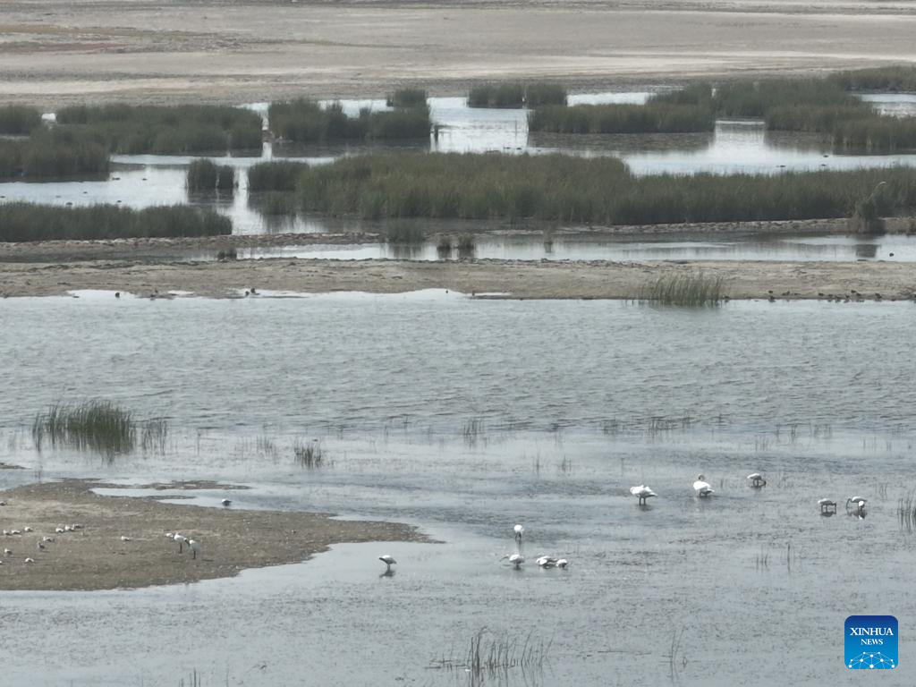 This aerial photo taken on Sept. 14, 2023 shows mute swans and fledglings foraging on the Ulan Suhai Lake in Bayannur, north China's Inner Mongolia Autonomous Region. Located at the apex of the meandering bends of the Yellow River, Ulan Suhai Lake, also known as Wuliangsu Lake, is the biggest lake wetland of the Yellow River basin. With continuous efforts on integrated protection and systematic management, the ecological environment of the Ulan Suhai Lake has been greatly improved in recent years.