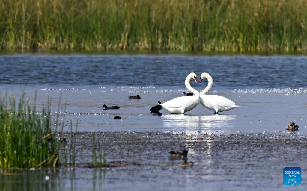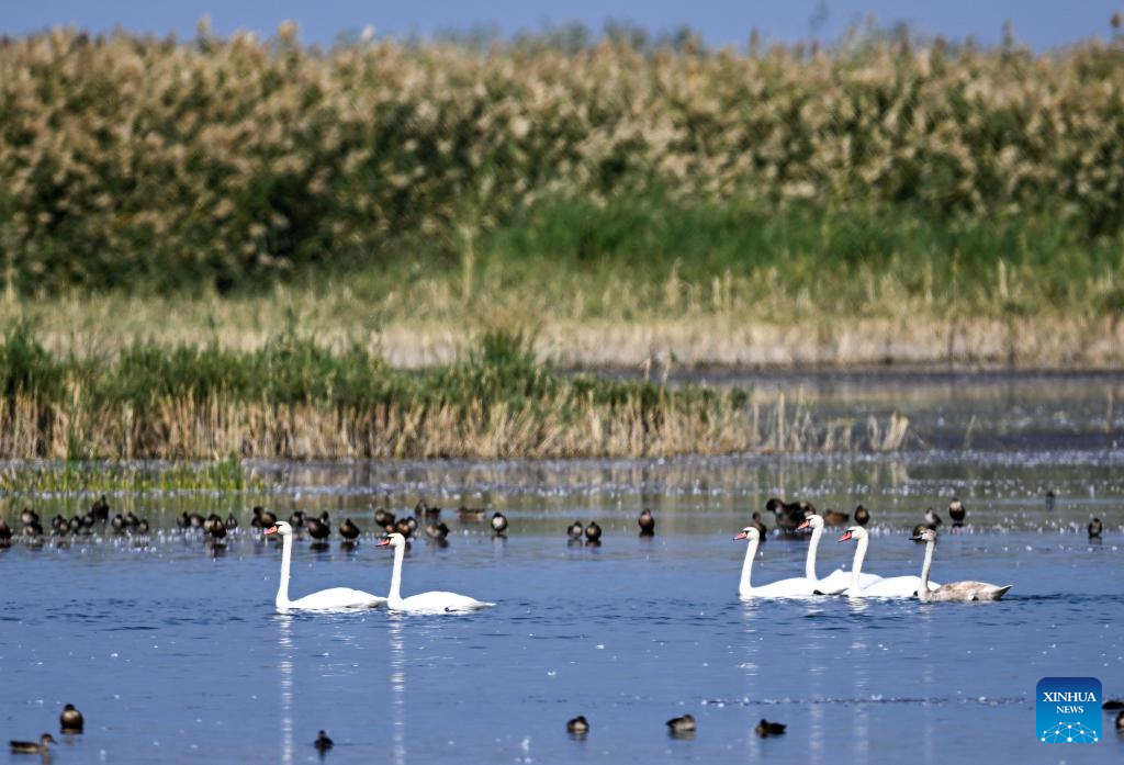 Mute swans are seen on the Ulan Suhai Lake in Bayannur, north China's Inner Mongolia Autonomous Region, Sept. 24, 2023. Located at the apex of the meandering bends of the Yellow River, Ulan Suhai Lake, also known as Wuliangsu Lake, is the biggest lake wetland of the Yellow River basin. With continuous efforts on integrated protection and systematic management, the ecological environment of the Ulan Suhai Lake has been greatly improved in recent years.