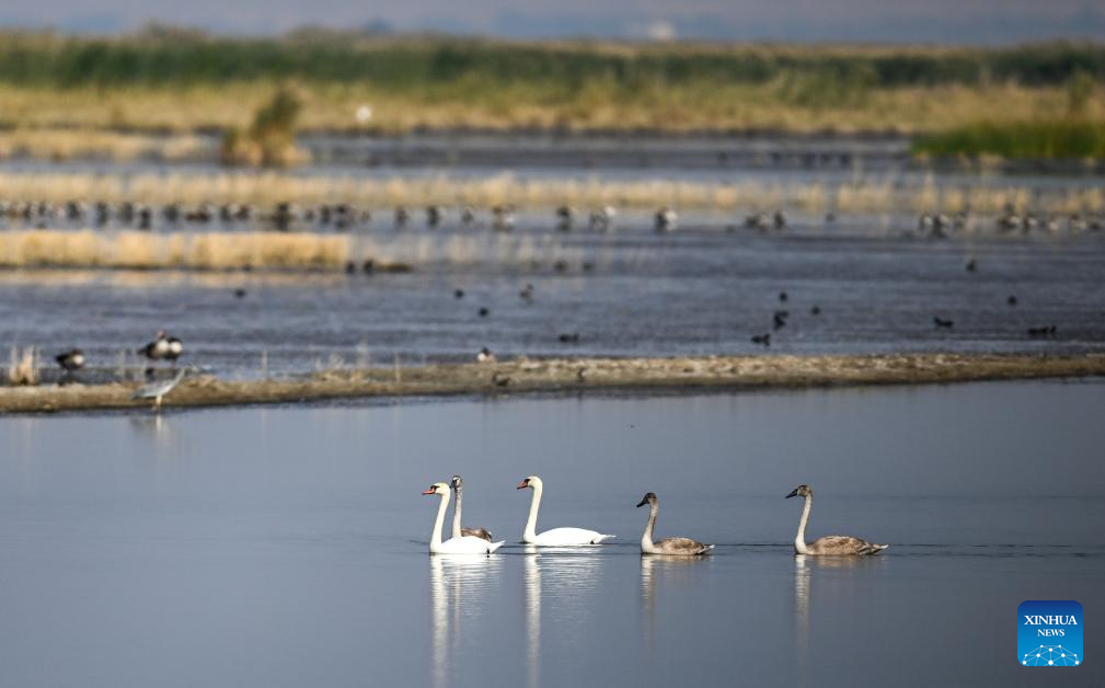 Mute swans and fledglings are seen on the Ulan Suhai Lake in Bayannur, north China's Inner Mongolia Autonomous Region, Sept. 24, 2023. Located at the apex of the meandering bends of the Yellow River, Ulan Suhai Lake, also known as Wuliangsu Lake, is the biggest lake wetland of the Yellow River basin. With continuous efforts on integrated protection and systematic management, the ecological environment of the Ulan Suhai Lake has been greatly improved in recent years.