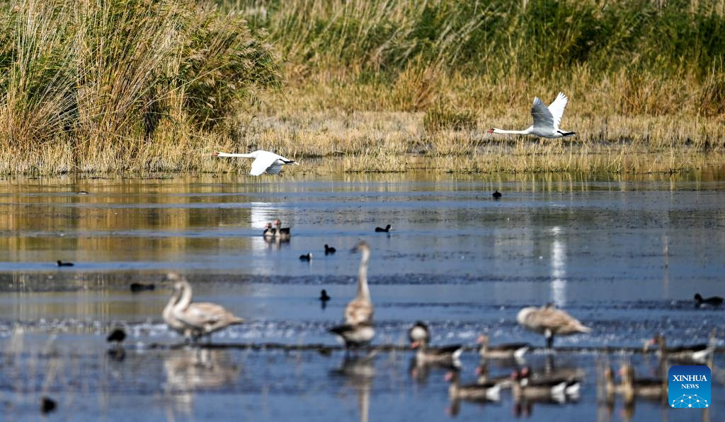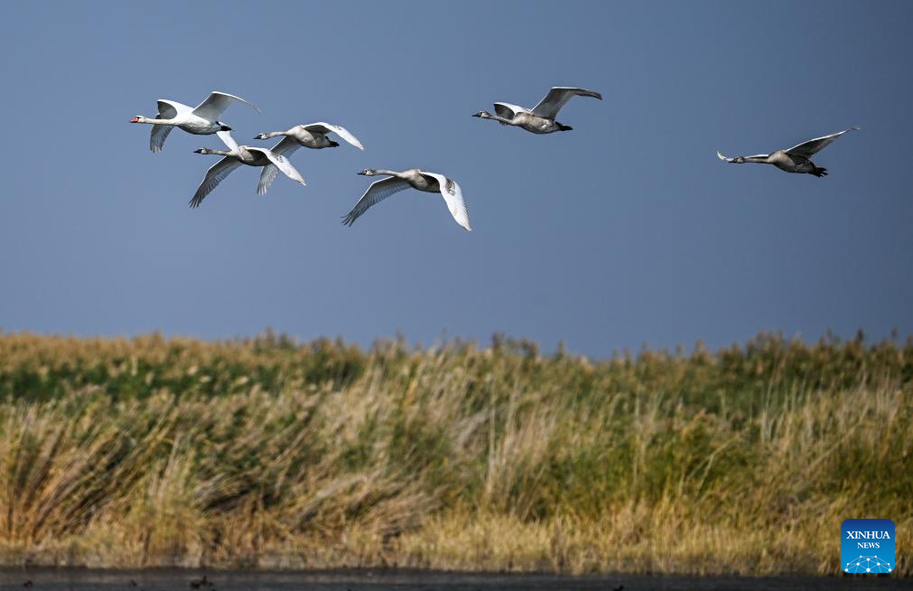 Mute swans fly above the Ulan Suhai Lake in Bayannur, north China's Inner Mongolia Autonomous Region, Sept. 24, 2023. Located at the apex of the meandering bends of the Yellow River, Ulan Suhai Lake, also known as Wuliangsu Lake, is the biggest lake wetland of the Yellow River basin. With continuous efforts on integrated protection and systematic management, the ecological environment of the Ulan Suhai Lake has been greatly improved in recent years.
