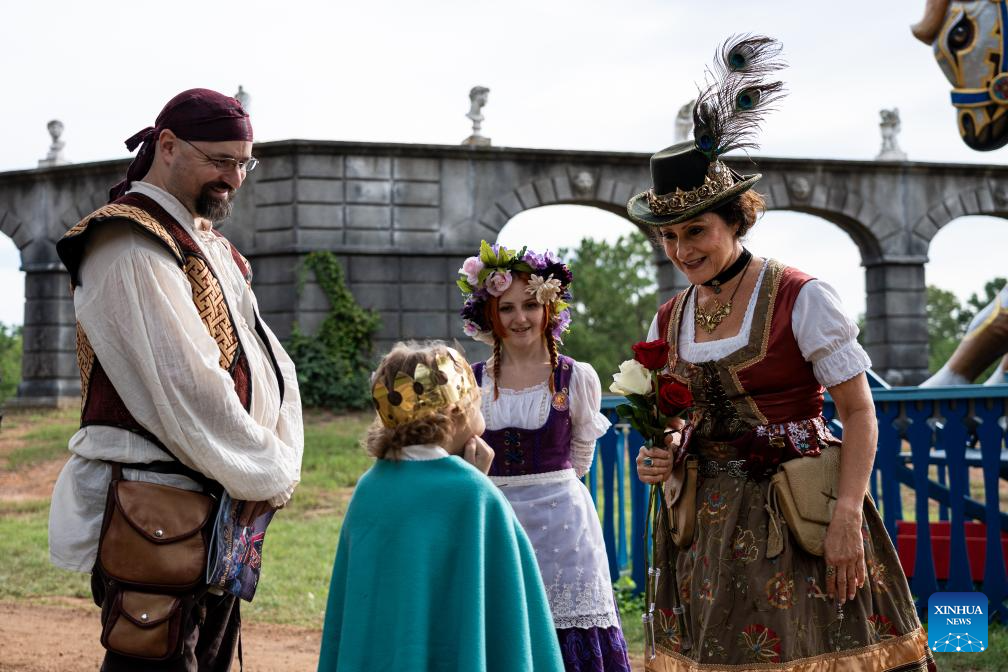 A person dressed in costumes takes part in Texas Renaissance Festival in Todd Mission, Texas, the United States, Oct. 7, 2023. Texas Renaissance Festival kicked off in the western U.S. state of Texas on Saturday, bringing the magic of the Renaissance time to life through Nov. 26. (Photo by Chen Chen/Xinhua)