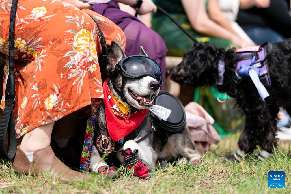 A service dog is seen during Texas Renaissance Festival in Todd Mission, Texas, the United States, Oct. 7, 2023. Texas Renaissance Festival kicked off in the western U.S. state of Texas on Saturday, bringing the magic of the Renaissance time to life through Nov. 26. (Photo by Chen Chen/Xinhua)