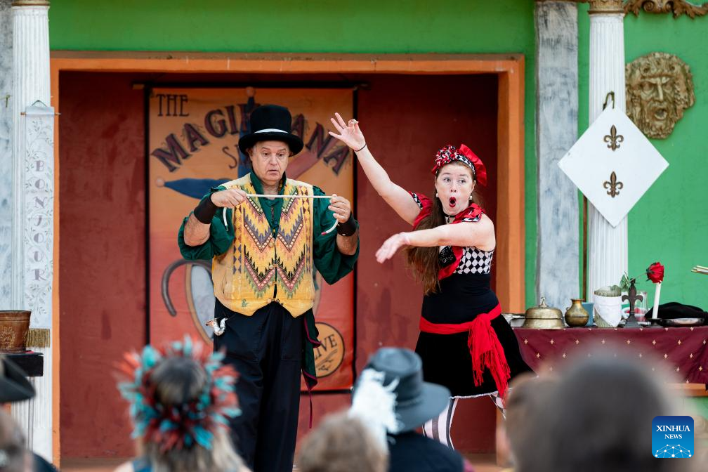 People dressed in costumes perform during Texas Renaissance Festival in Todd Mission, Texas, the United States, Oct. 7, 2023. Texas Renaissance Festival kicked off in the western U.S. state of Texas on Saturday, bringing the magic of the Renaissance time to life through Nov. 26. (Photo by Chen Chen/Xinhua)