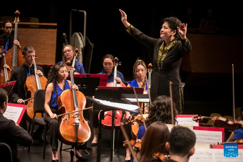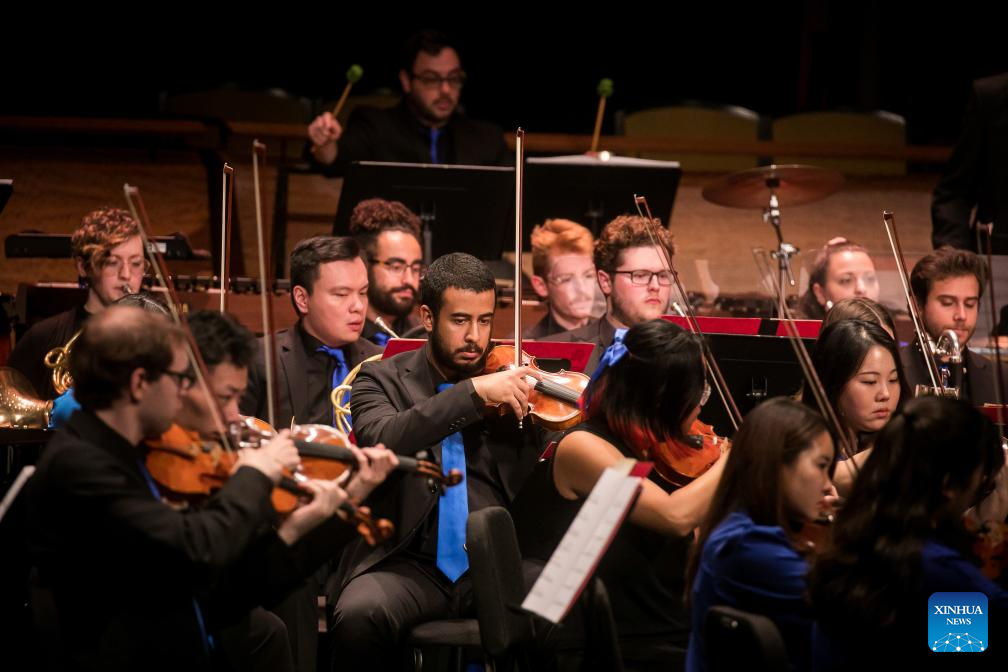 Members of The Orchestra Now perform at Jazz at Lincoln Center in New York, the United States, Oct. 8, 2023. The sixth season of the China Now Music Festival culminated in a grand finale on Sunday in a spellbinding concert at Jazz at Lincoln Center in New York City, paying homage to three generations of composers bridging the United States and China. (Photo by Michael Nagle/Xinhua)