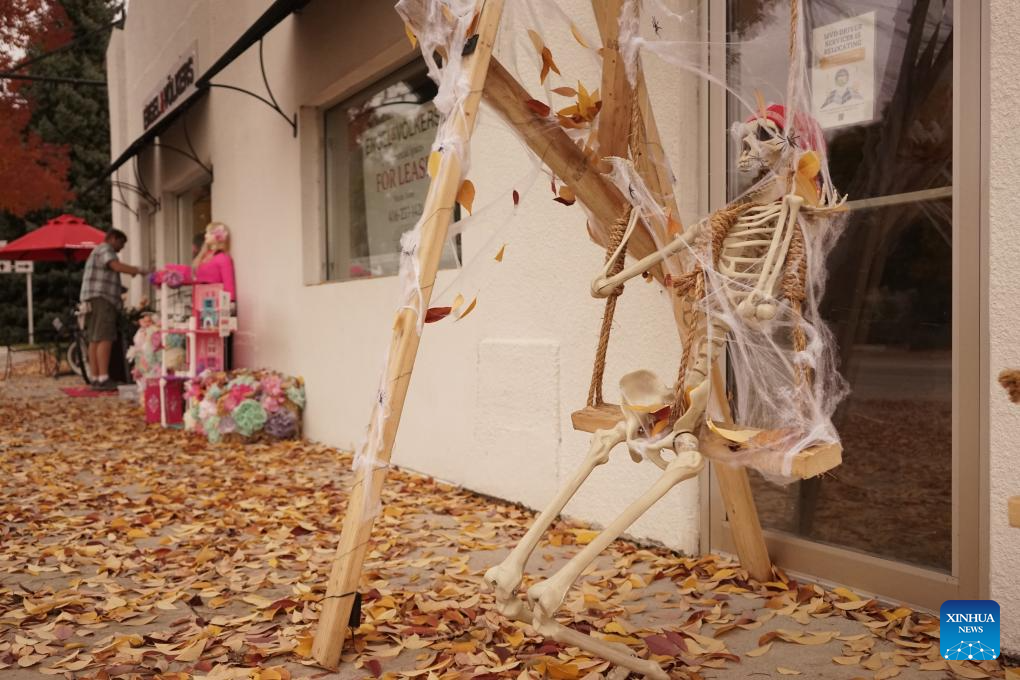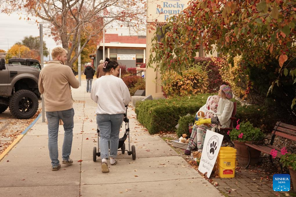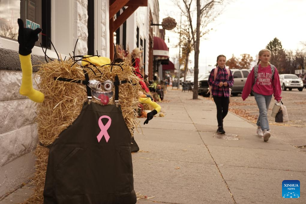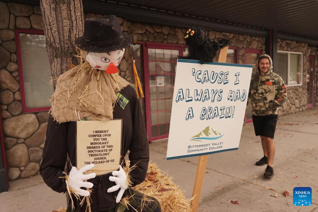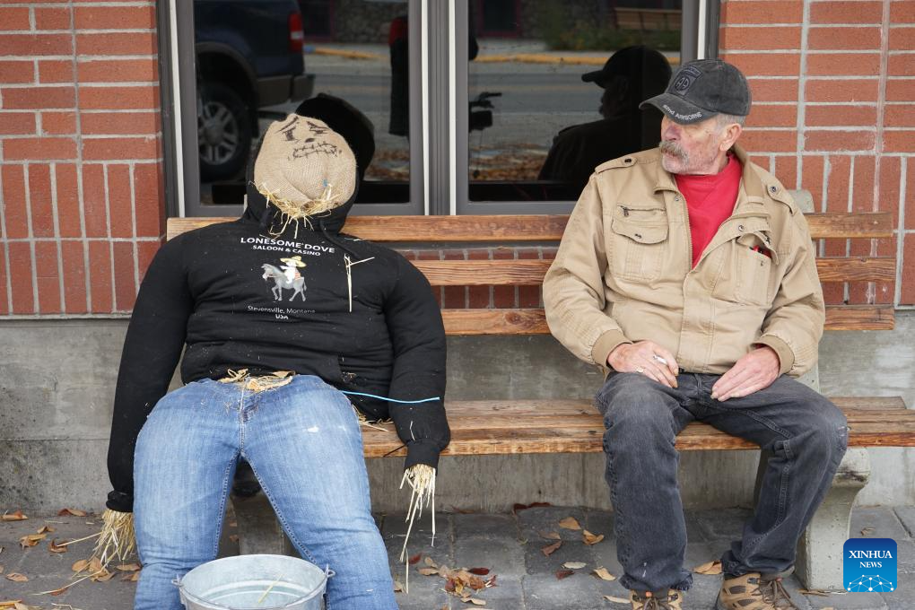 Scarecrows are seen in Stevensville, Montana, the United States, on Oct. 12, 2023. A scarecrow festival is being held in the U.S. state of Montana this week to celebrate the autumn season and the upcoming Halloween in the country. (Photo by Zeng Hui/Xinhua)