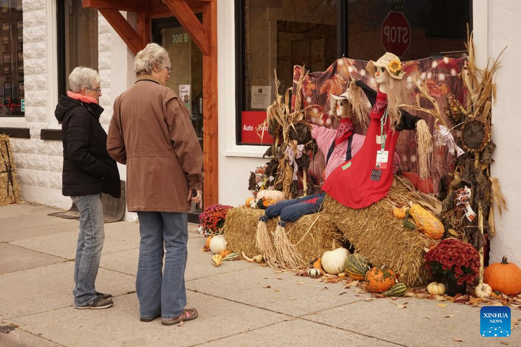 People look at a scarecrow in Stevensville, Montana, the United States, on Oct. 12, 2023. A scarecrow festival is being held in the U.S. state of Montana this week to celebrate the autumn season and the upcoming Halloween in the country. (Photo by Zeng Hui/Xinhua)