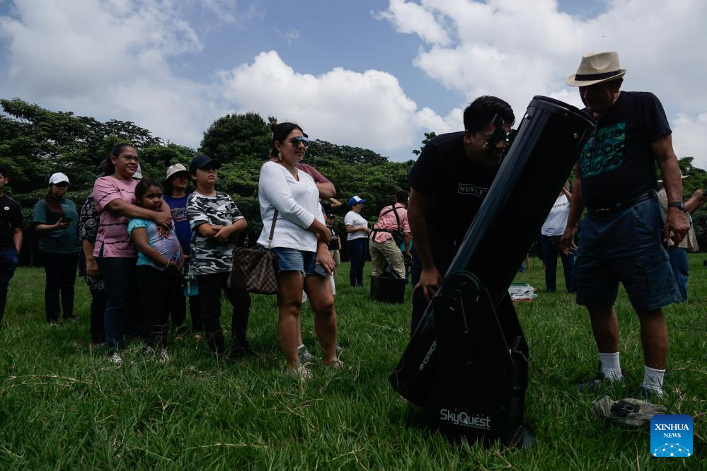 People observe a solar eclipse in San Salvador, El Salvador, Oct. 14, 2023. (Photo by Alexander Pena/Xinhua)