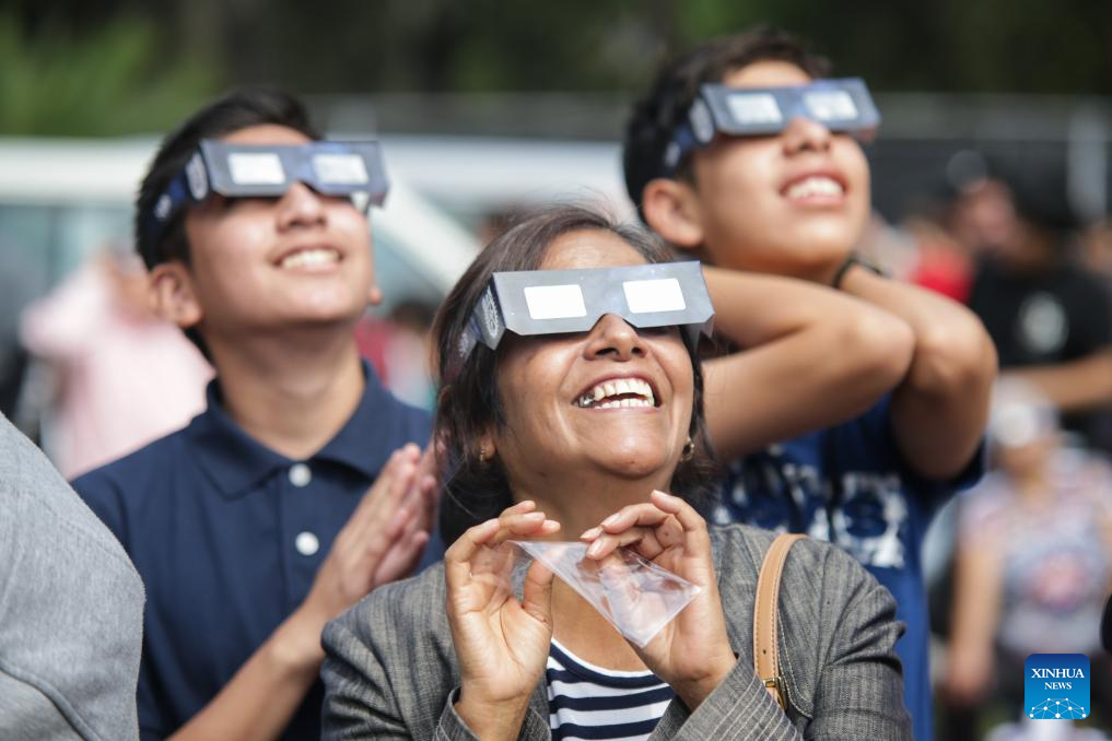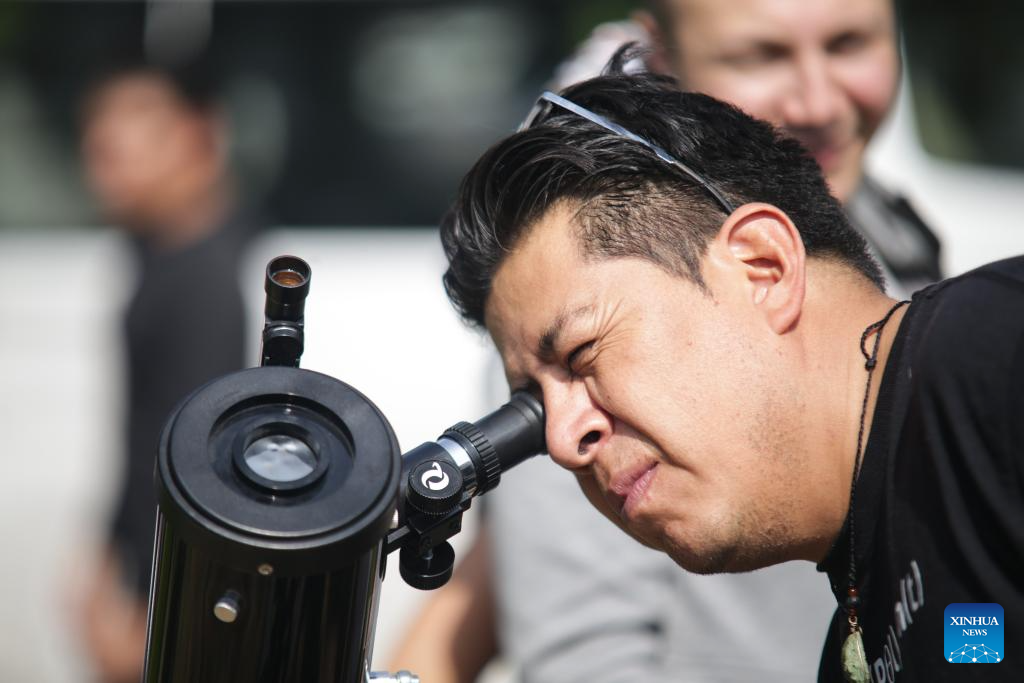 People observe a solar eclipse in Mexico City, Mexico, Oct. 14, 2023. (Photo by Francisco Canedo/Xinhua)