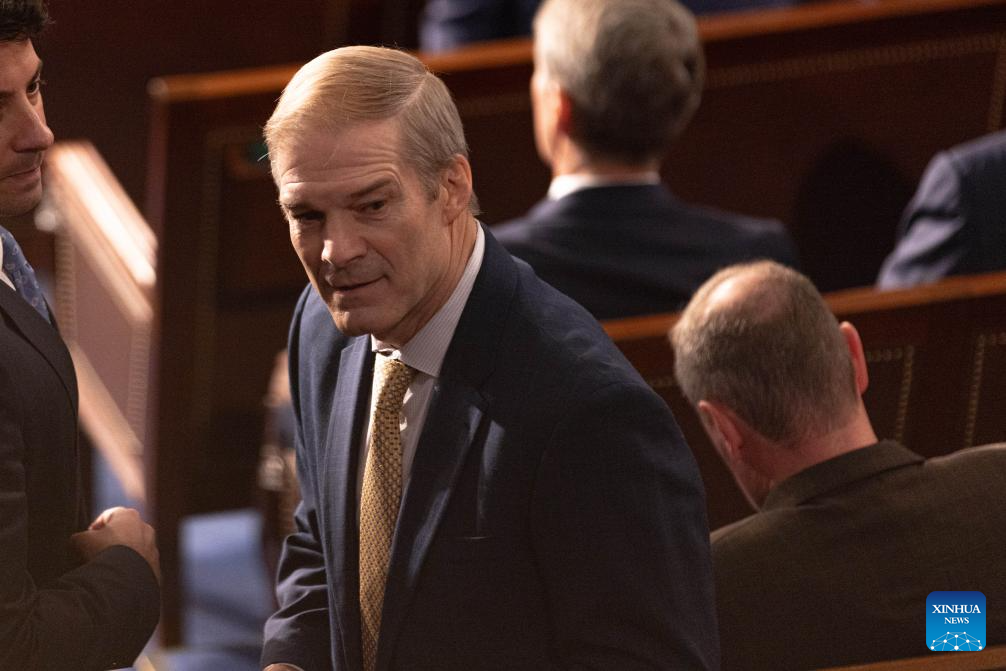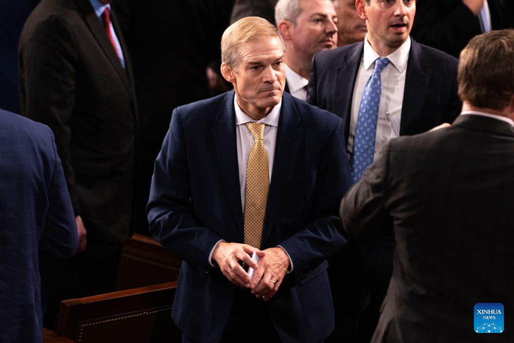 U.S. Right-wing Republican Jim Jordan (C), chairman of the House Judiciary Committee, is seen in the House Chamber during a speaker voting in Washington, D.C., the United States, Oct. 17, 2023. The U.S. House of Representatives on Tuesday failed to elect a new speaker in the first round of voting, as Jim Jordan didn't garner enough support from his own party two weeks after the historical ouster of Kevin McCarthy. (Photo by Aaron Schwartz/Xinhua)