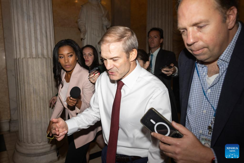 U.S. Right-wing Republican Jim Jordan (C), chairman of the House Judiciary Committee, is seen in the Capitol Building in Washington, D.C., the United States, on Oct. 16, 2023. The U.S. House of Representatives on Tuesday failed to elect a new speaker in the first round of voting, as Jim Jordan failed to garner enough support from his own party two weeks after the historical ouster of Kevin McCarthy. (Photo by Aaron Schwartz/Xinhua)