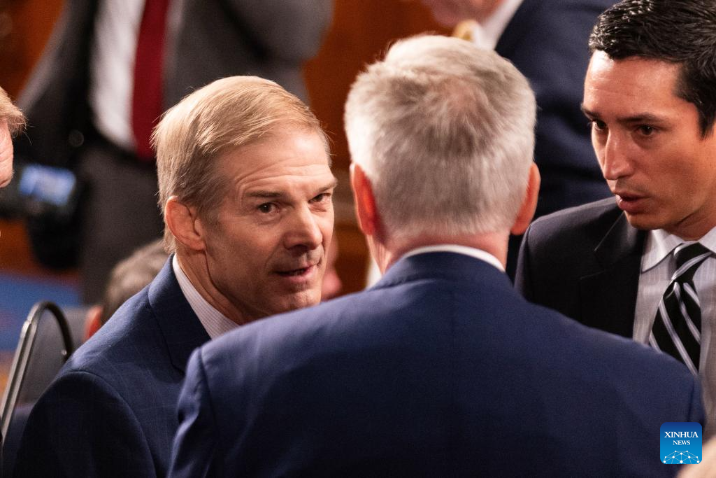 U.S. Right-wing Republican Jim Jordan (L), chairman of the House Judiciary Committee, is seen in the House Chamber during a speaker voting in Washington, D.C., the United States, Oct. 17, 2023. The U.S. House of Representatives on Tuesday failed to elect a new speaker in the first round of voting, as Jim Jordan didn't garner enough support from his own party two weeks after the historical ouster of Kevin McCarthy. (Photo by Aaron Schwartz/Xinhua)