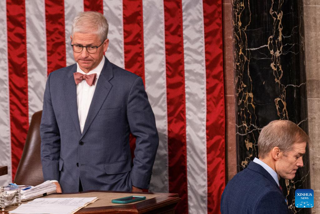 U.S. Right-wing Republican Jim Jordan (R), chairman of the House Judiciary Committee, is seen with Speaker Pro Tempore Patrick McHenry in the House chamber in Washington, D.C., the United States, on Oct. 18, 2023. The U.S. House of Representatives on Wednesday failed to elect a new speaker in the second round of voting, as Right-wing Republican Jim Jordan, chairman of the House Judiciary Committee, lost more votes from his own party compared with the first round amid continued Republican infighting. (Photo by Aaron Schwartz/Xinhua)