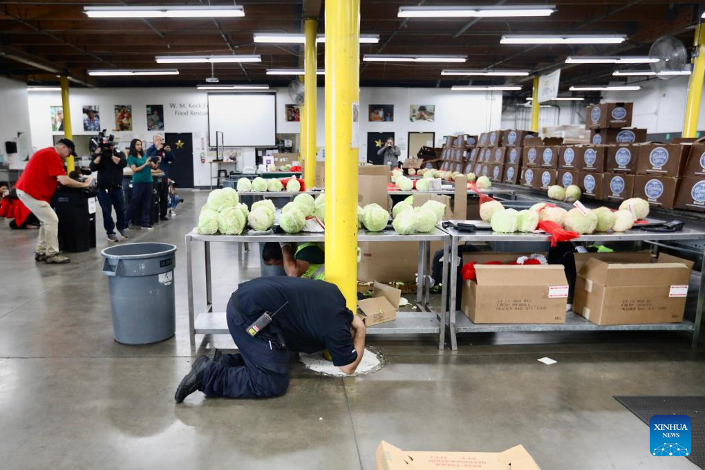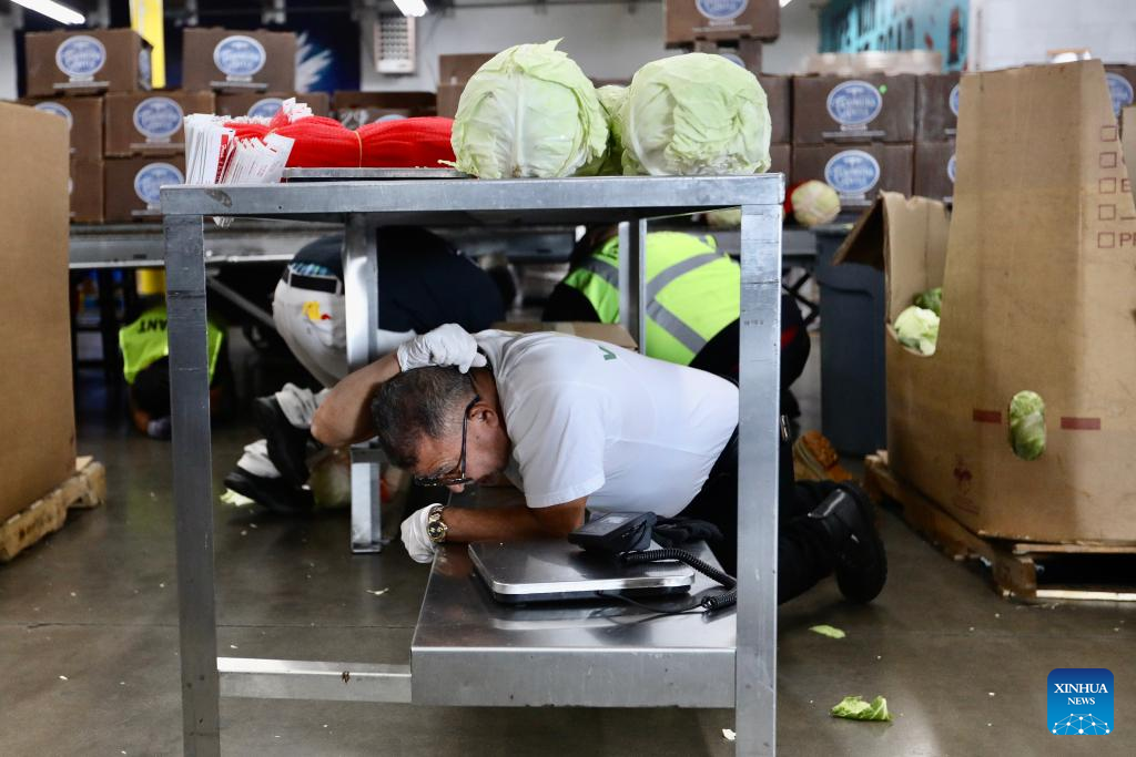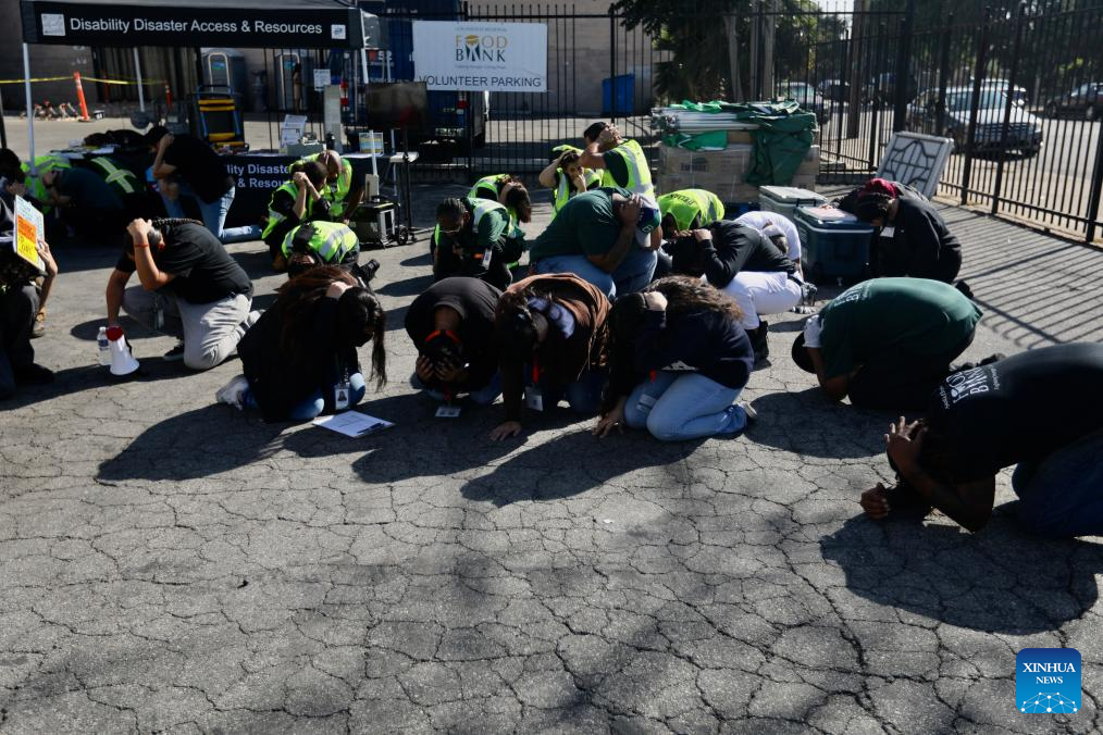 People do a Drop, Cover, and Hold On earthquake drill at the L.A. Regional Food Bank in Los Angeles, California, the United States, on Oct. 19, 2023. An annual earthquake drill was held across the United States on Thursday, in an aim to help people better protect themselves during earthquakes. (Xinhua)