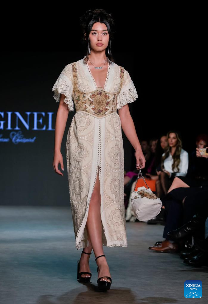 A model presents a creation by Originel during the Spring Summer 2024 Collections Fashion Show at Vancouver Fashion Week in Vancouver, Canada, on Oct. 21, 2023. (Photo by Liang Sen/Xinhua)