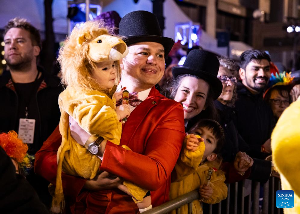 Costumed spectators are pictured at the Art in the Dark Halloween Parade on State Street in downtown Chicago, the United States, Oct. 21, 2023. (Photo by Joel Lerner/Xinhua)