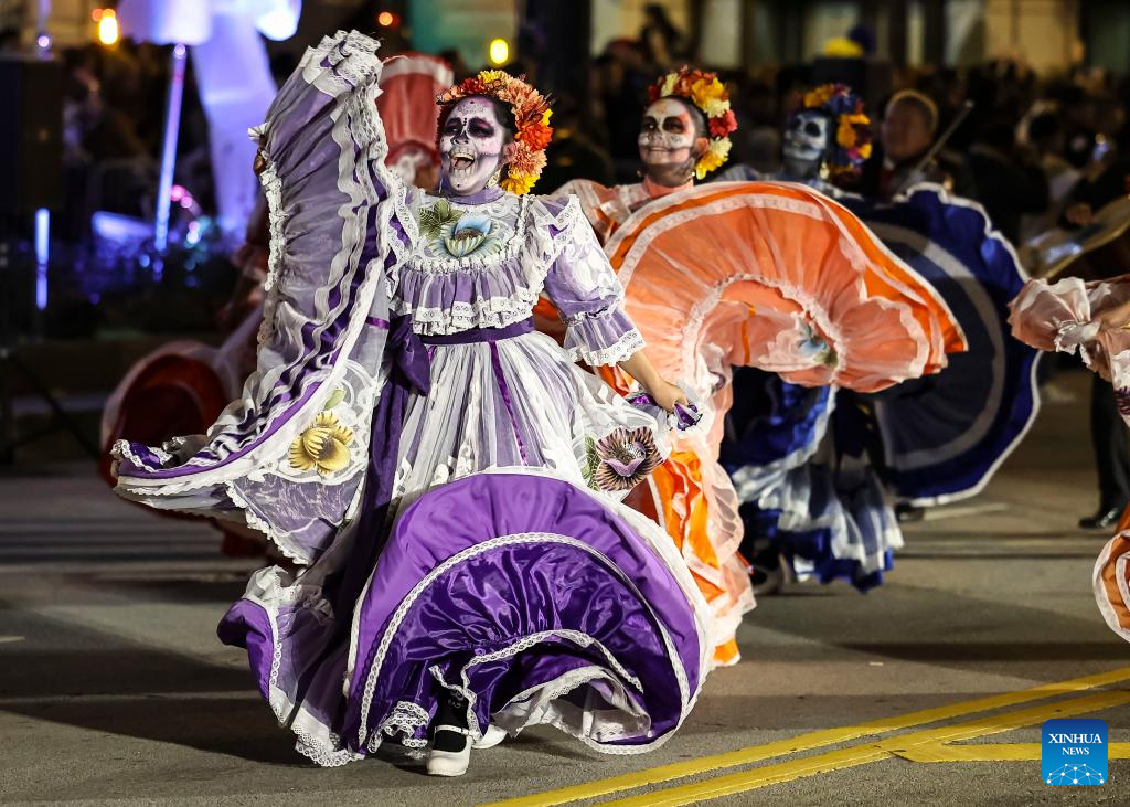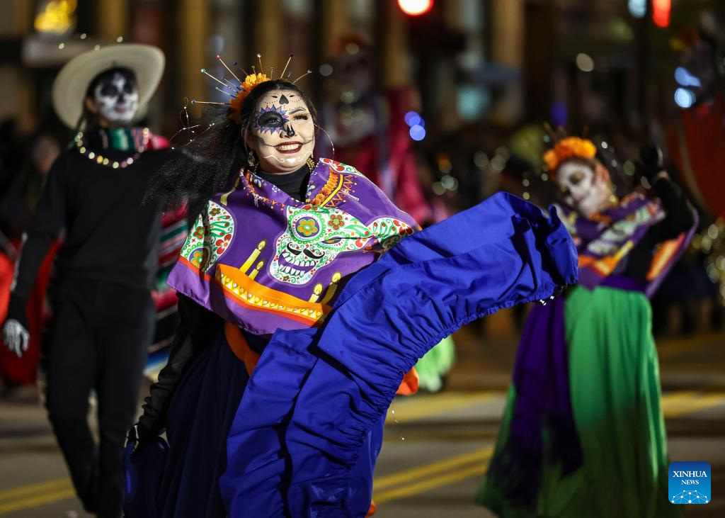 Mexican dancers are pictured at the Art in the Dark Halloween Parade on State Street in downtown Chicago, the United States, Oct. 21, 2023. (Photo by Joel Lerner/Xinhua)