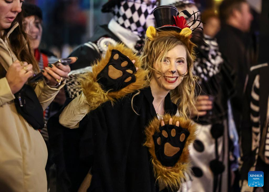 A costumed spectator is pictured at the Art in the Dark Halloween Parade on State Street in downtown Chicago, the United States, Oct. 21, 2023. (Photo by Joel Lerner/Xinhua)