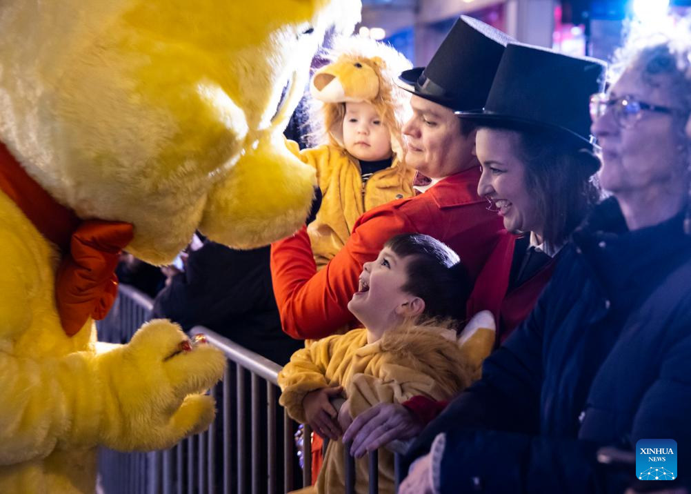 A spectator greets a bear character during the Art in the Dark Halloween Parade on State Street in downtown Chicago, the United States, Oct. 21, 2023. (Photo by Joel Lerner/Xinhua)