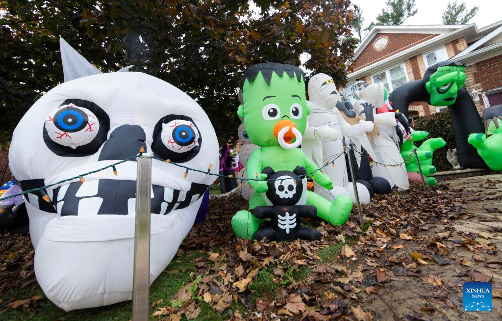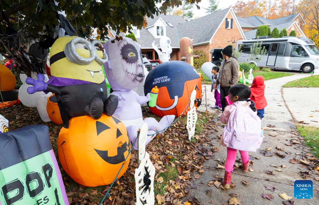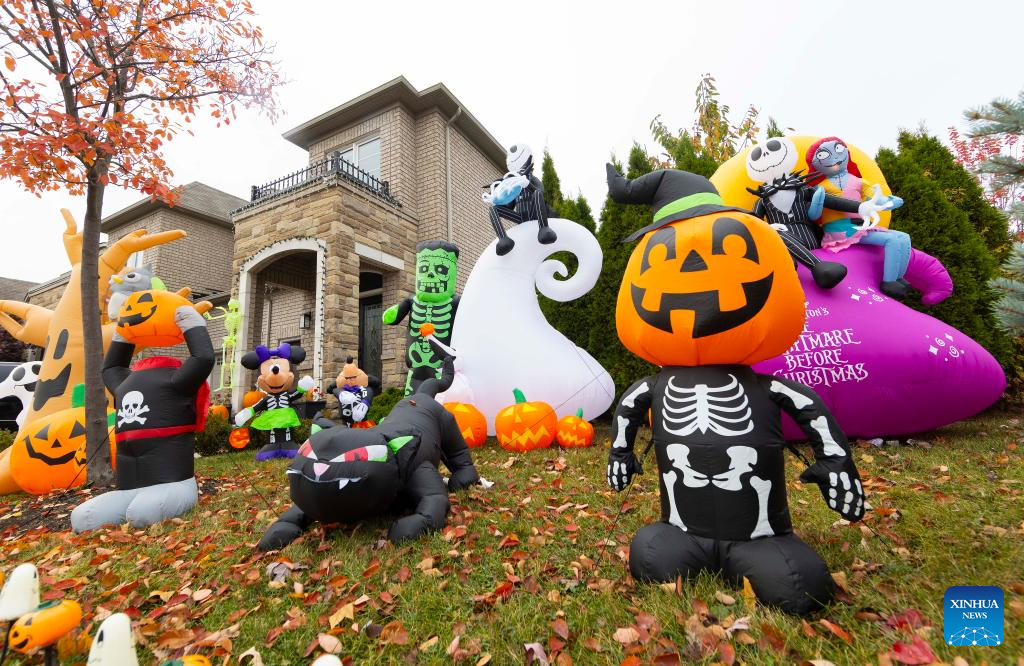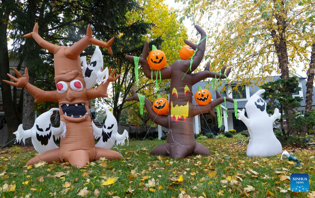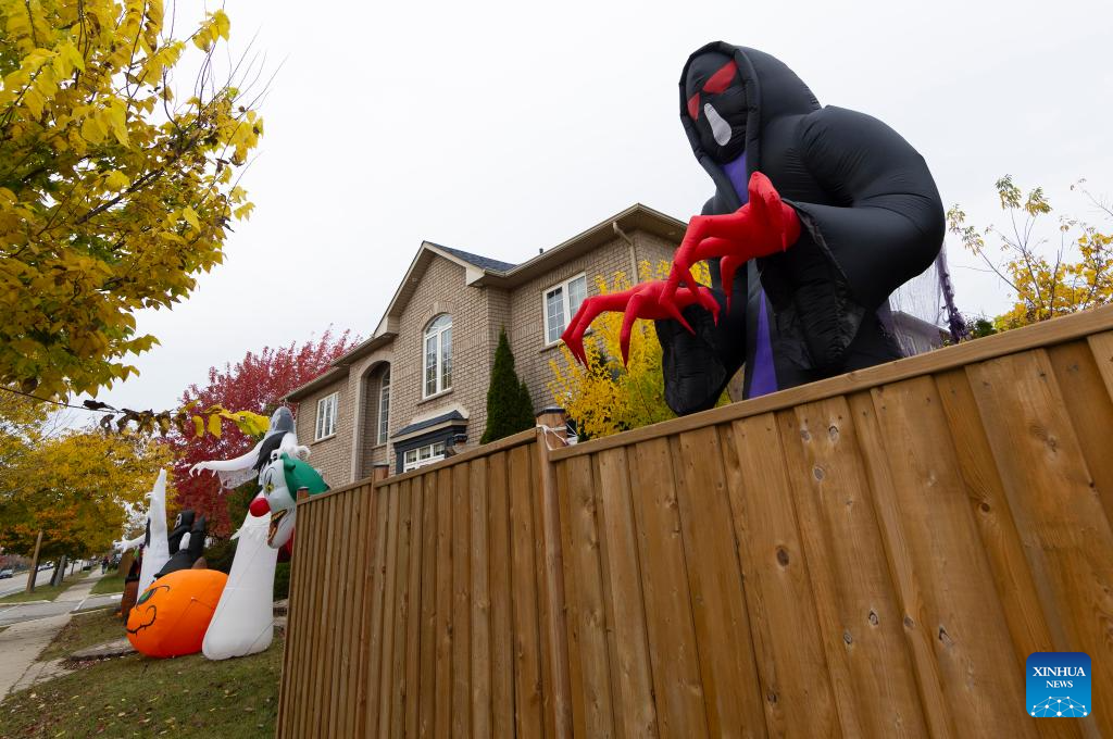 Decorations for the upcoming Halloween are seen in front of a house in Oakville, Ontario, Canada, on Oct. 26, 2023. (Photo by Zou Zheng/Xinhua)