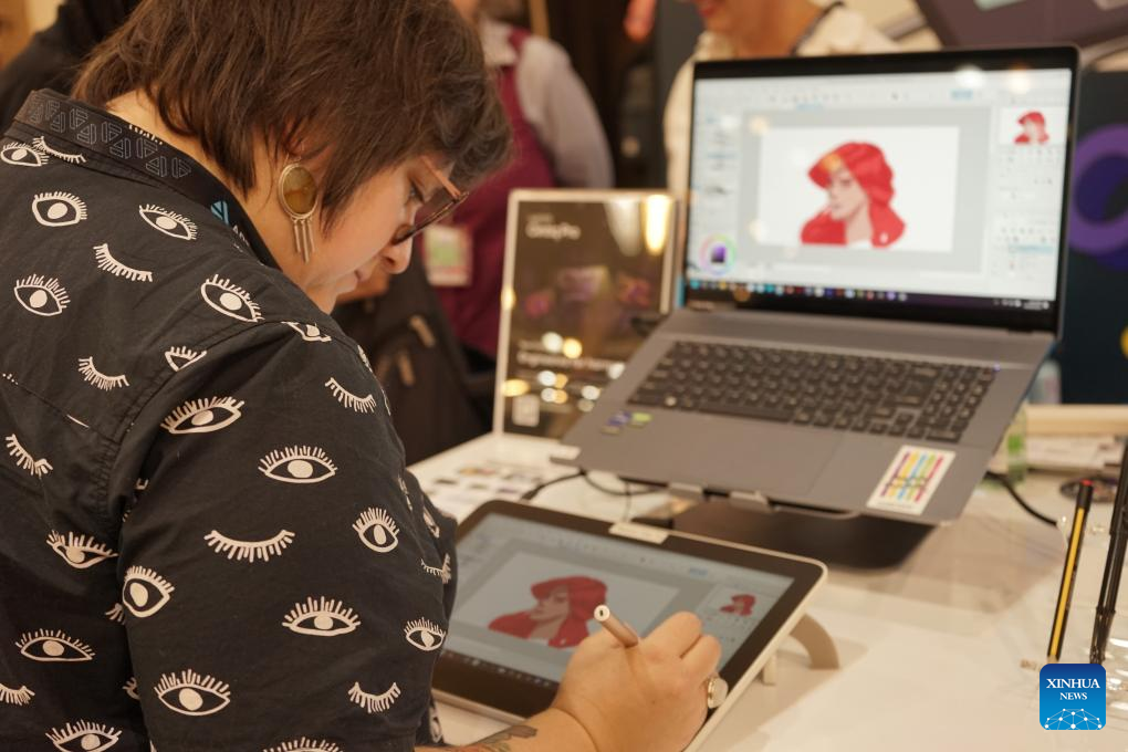 An artist creates artwork at the LightBox Expo 2023 at the Pasadena convention center in Pasadena, California, the United States, Oct. 28, 2023. (Photo by Zeng Hui/Xinhua)