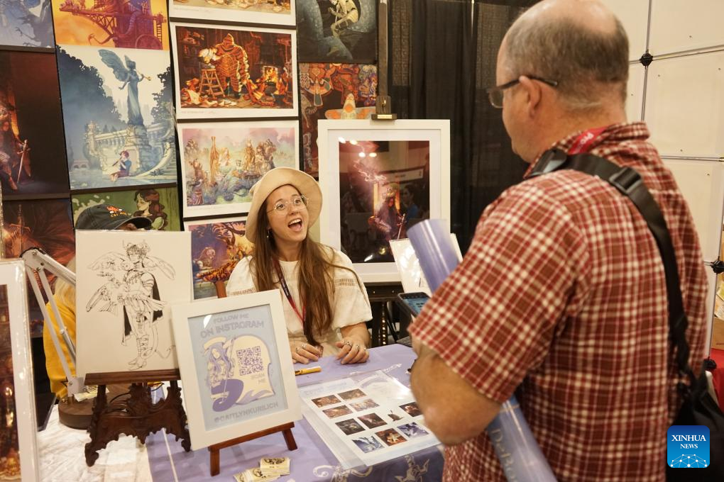 A visitor talks with an artist at the LightBox Expo 2023 at the Pasadena convention center in Pasadena, California, the United States, Oct. 28, 2023. (Photo by Zeng Hui/Xinhua)