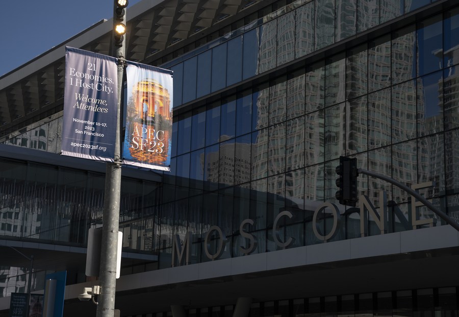 This photo taken on Nov. 7, 2023 shows banners depicting the upcoming 30th APEC Economic Leaders' Meeting outside the venue of the meeting in San Francisco, California, the United States. (Photo by Li Jianguo/Xinhua)