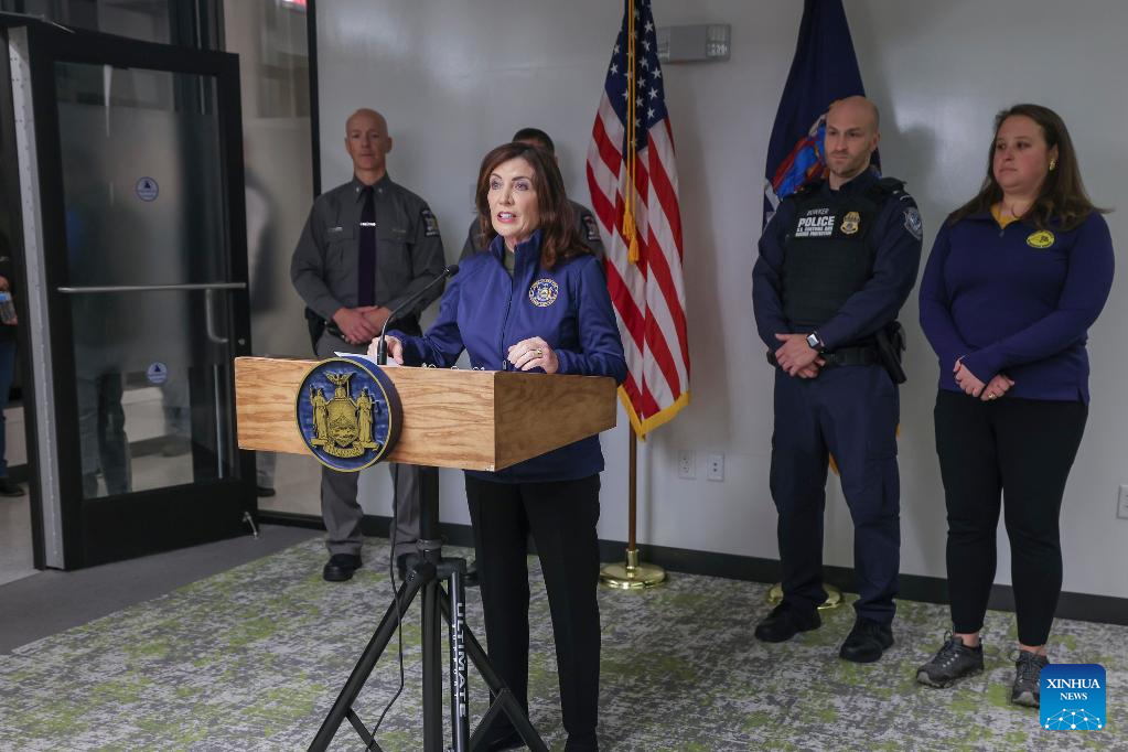 New York State Governor Kathy Hochul (front) holds a press briefing on a vehicle explosion at a border crossing between the United States and Canada, in Niagara Falls, New York State, the United States, Nov. 22, 2023. There is no indication of terrorist involvement in a vehicle explosion that claimed two lives at a border crossing between the United States and Canada in Niagara Falls on Wednesday, said New York State Governor Kathy Hochul.