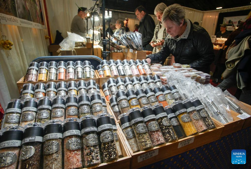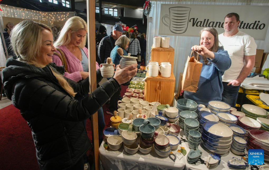 People visit the Make It show in Vancouver, British Columbia, Canada, Dec. 8, 2023. The trade event dedicated to handmade items features exhibitors from across Canada, offering a diverse range of handmade goods. (Photo by Liang Sen/Xinhua)
