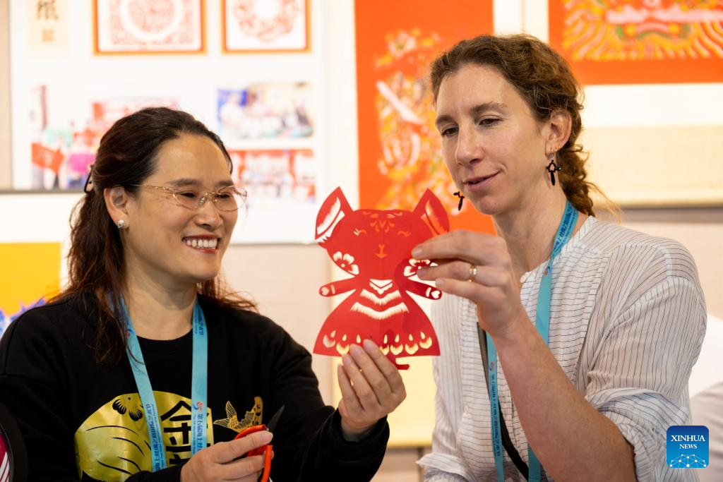 An Italian artist (R) learns about paper-cutting techniques from You Jinmei, an inheritor of intangible cultural heritage, during an intangible cultural heritage exhibition on the Maritime Silk Road in Quanzhou, southeast China's Fujian Province, Dec. 9, 2023. The city of Quanzhou is widely believed to be the starting point of the ancient Maritime Silk Road. (Xinhua/Wei Peiquan)