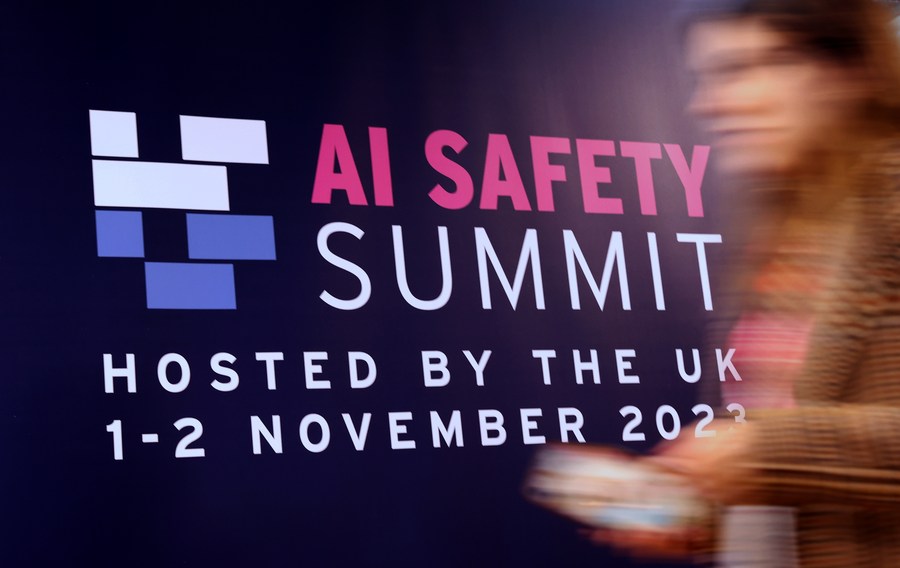 An attendee walks past a billboard of AI Safety Summit in Bletchley Park, Britain, Nov. 2, 2023. A declaration on artificial intelligence (AI) safety was issued during the summit here. (Xinhua/Li Ying)